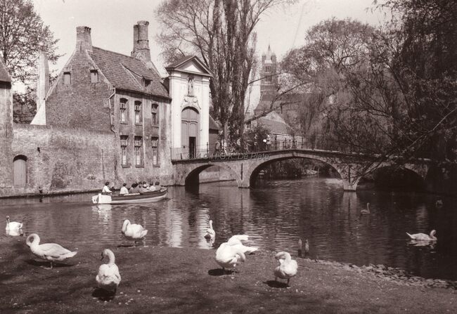Een rondvaartbootje passeert op het Minnewater te Brugge.Op de achtergrond de Sint Salvator kerk.