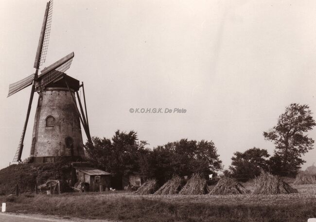 Een stenen windmolen op een terp.Het vlas staat te drogen op het veld.