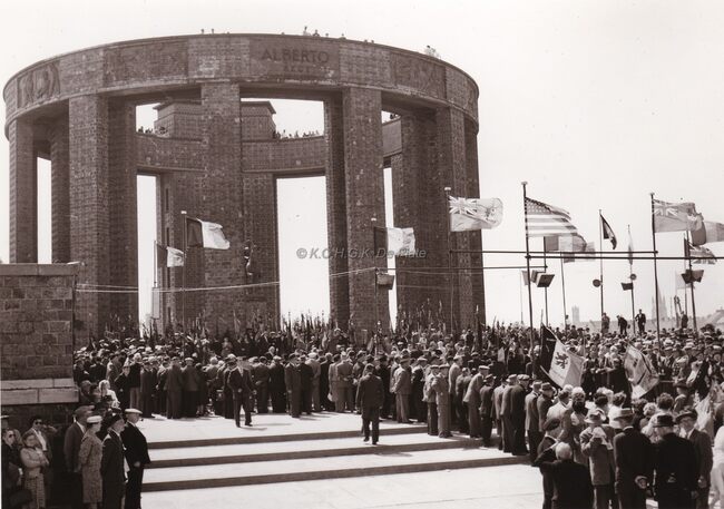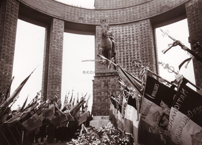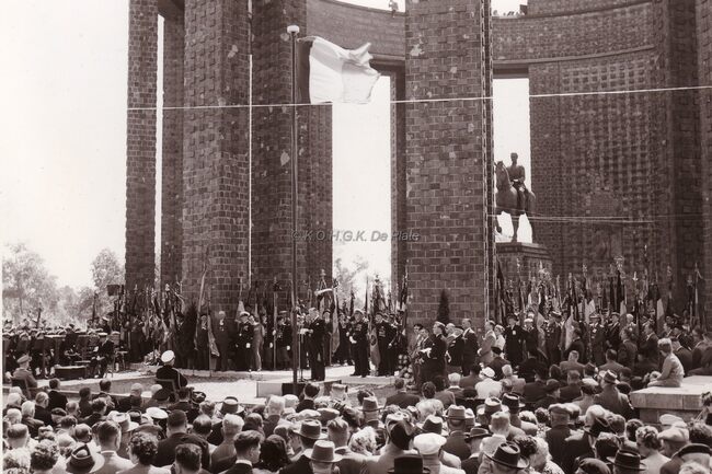 Jaarlijkse hulde door de oudstrijdersverenigingen aan het monument Albert I te Nieuwpoort.Centraal vooraan een oudstrijder in het uniform van een "piot" uit het Belgisch leger van het begin van Wereldoorlog I…
