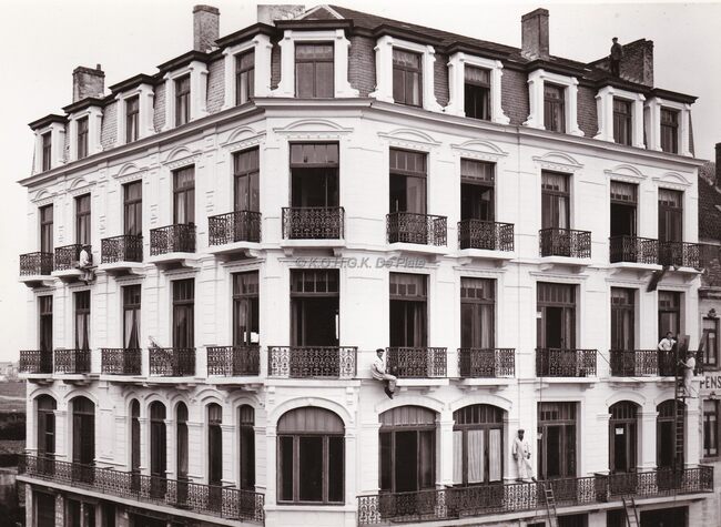Huisschilders aan het werk hoek Raversijdestraat en Vergeet-mij-nietjeslaan. Het vroegere "Hôtel Beau Séjour"