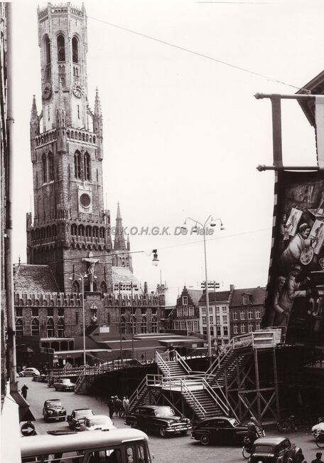 De grote markt vol tijdelijke constructies.Centraal de Halletoren.