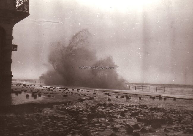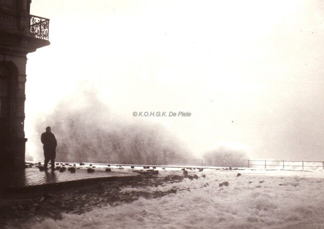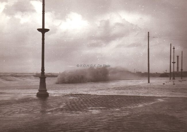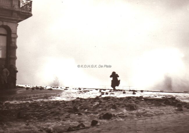 Zwaar stormweer,de golven slaan over aan de Albert I ¨Promenade tegen hoek Capucijnenstraat (?).Veel stenen uit het wegdek gespoeld.