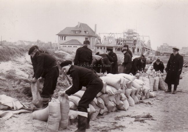 Marinepersoneel vult vaderlandertjes met duinzand ergens op Mariakerke.