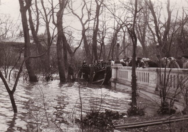 Een groep nieuwsgierigen constateren van op een bruggetje in het Leopoldpark hoe hoog het water wel staat.Links tussen de bomen de kiosk.