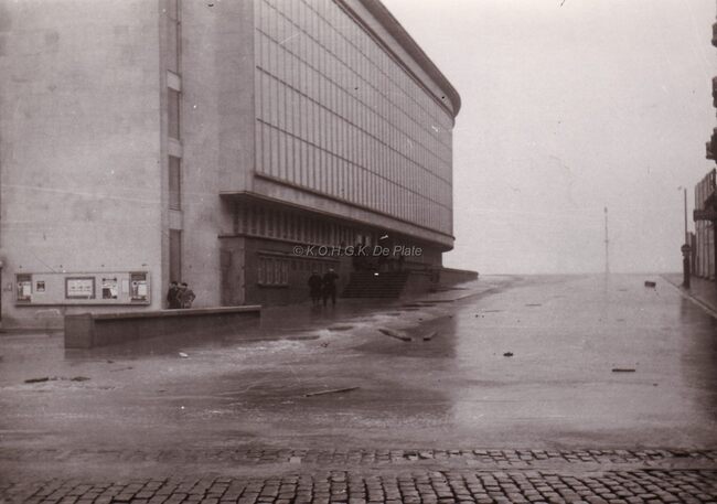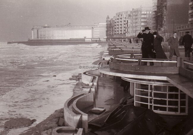 Het klein strand en het Zeeheldenplein,waar het monument voor de Zeelieden nog niet staat,tijdens een voorjaarsstorm (1949).Foto van op het weststaketsel.