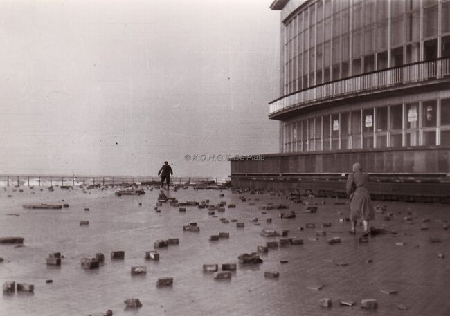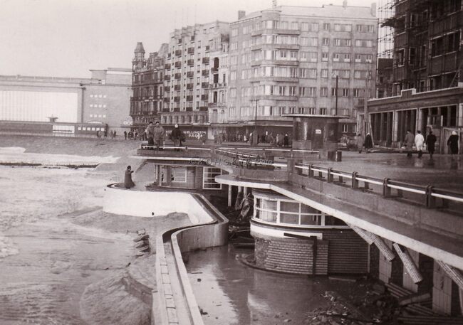 Kursaal-Oosthelling na de grote overstroming van 1953.Op de achtergrond (weer) overslaande golven. Zie ook 2014/0159.