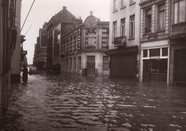De Langestraat met rechts de Hertstraat onder water na de grote overstroming van 1953.Naast de Casanova op de hoek van de Hertstraat,de cinema's Rialto en Corso.Op de volgende hoek (Christinastraat) de zeer gekende…