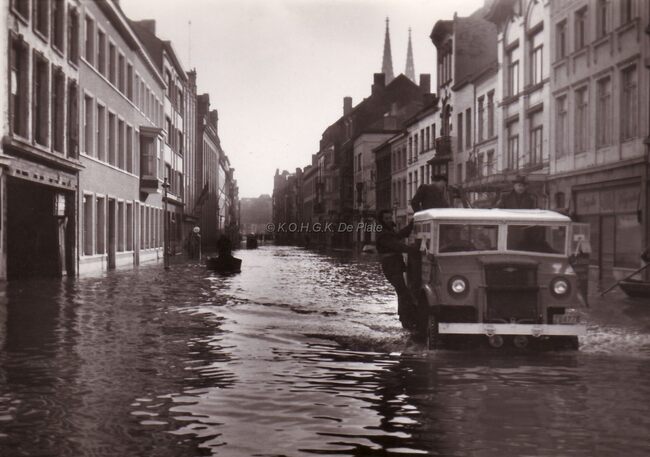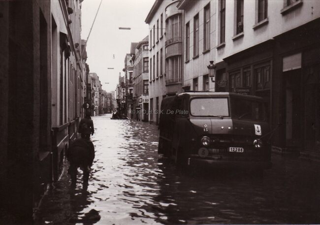 Een vrachtwagen rijdt door de overstroomde Kaaistraat na de grote overstroming van 01-02-1953,Links studie notaris SEBRECHTS,naast de poort.Foto van aan de Groentenmarkt richting Petrus en Pauluskerk.