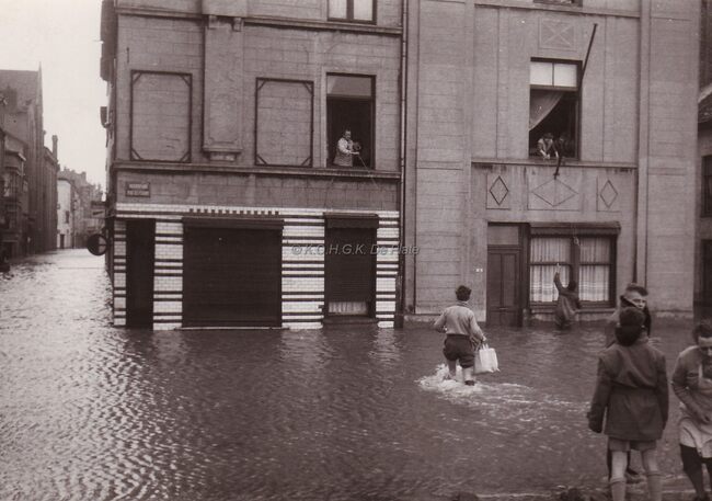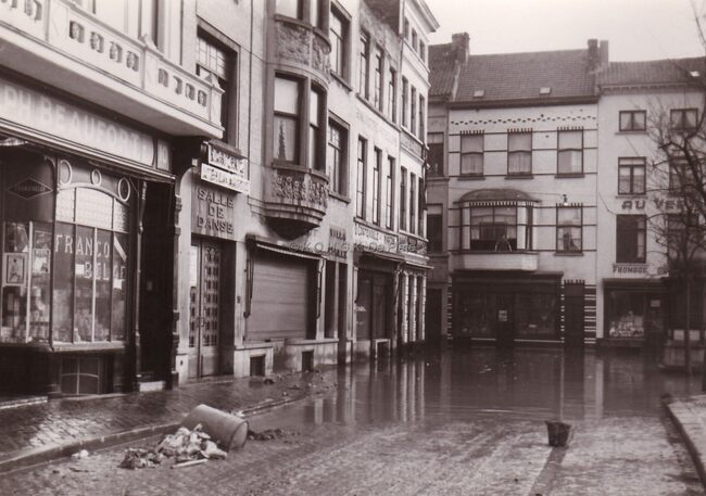 De Groentemarkt en de hoek met de Dwarsstraat onder water na de overstroming van 01-02-1953. Naast de "Franco Belge" (links), de zeer gekende Oostendse dancing : de "Valentino". Op de hoek van de…
