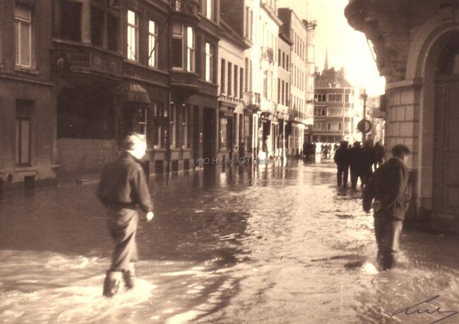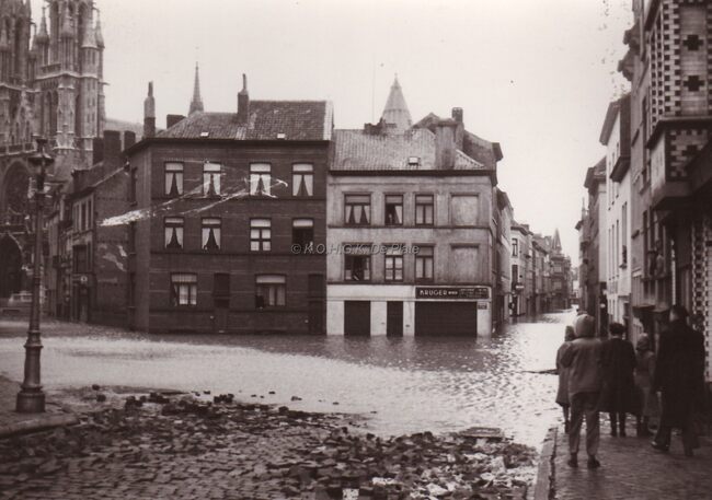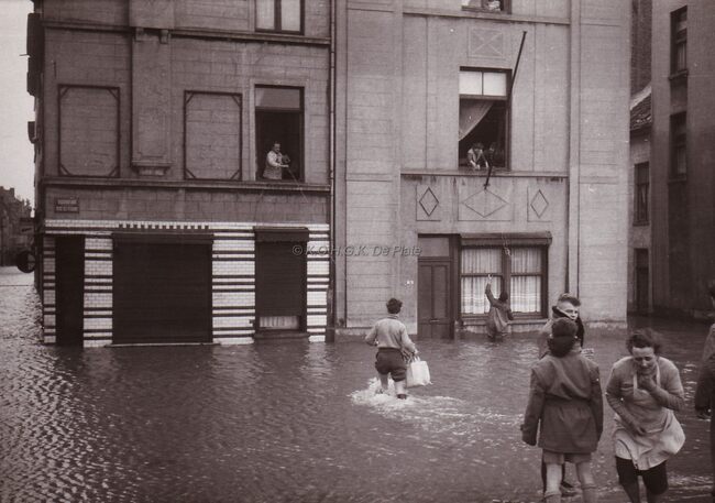 Formaat : 13 x 18 cm. - Het Pauluspleintje onder water tijdens de overstroming van 1953. Links, de Pastoor Pypestraat en rechts, de Sint-Franciscusstraat. Rechtdoor, de Sint-Paulusstraat.