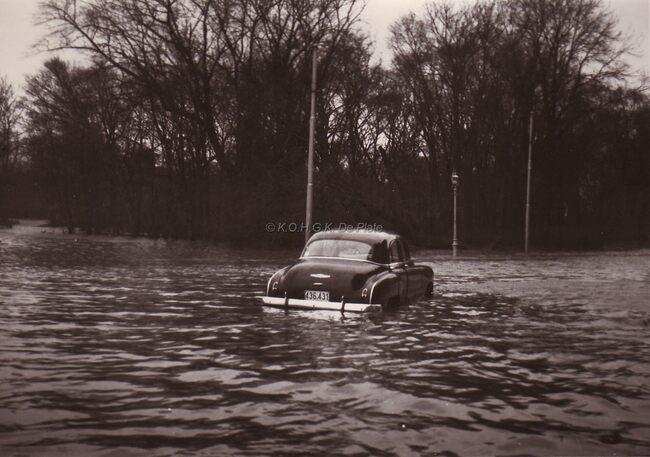 Een wagen in de Hendrik Serruyslaan,aan het Leopoldpark,verrast door het zeewater tijdens de grote overstroming (1953).