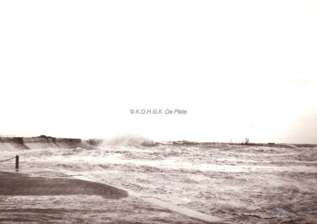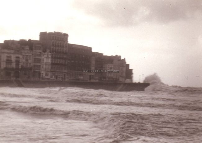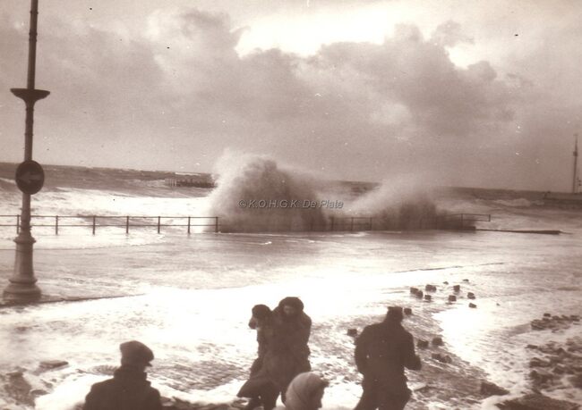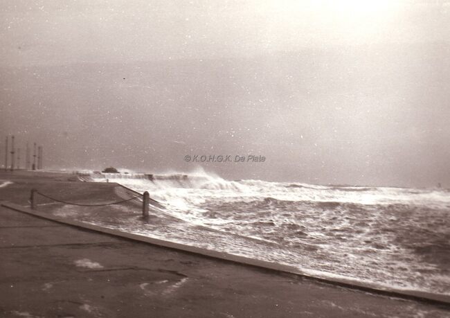 Zicht op het klein strand bij storm (hoog tij),links het Zeehelden plein,nog zonder monument,rechts het westerstaketsel.