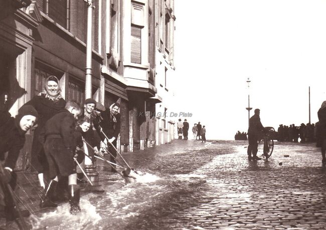 Op de helling in de Hofstraat zijn enkele vrouwen en kinderen druk in de weer om het door de storm overgeslagen water weg te houden van hun huizen.