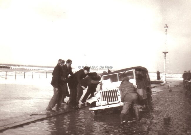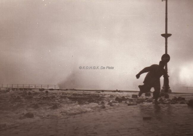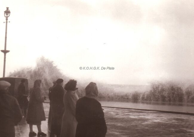 Kijkers tornen tegen de stormwind de Vlaanderenhelling op na de grote overstroming 1953. (Of worden er afgejaagd !)