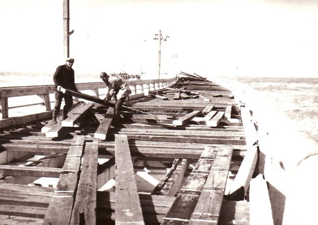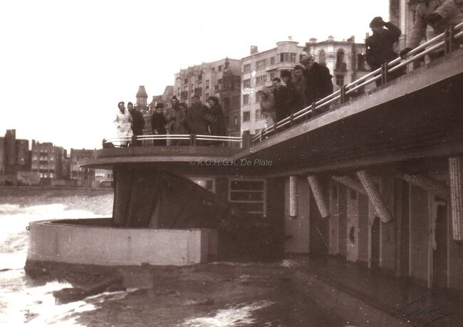 De schade aan de badinstallaties na een zware voorjaarstorm (1949). In alle tijden zijn de ramptoeristen er als de kippen bij om vast te stellen hoe erg het wel was.