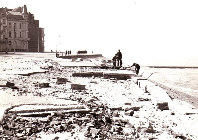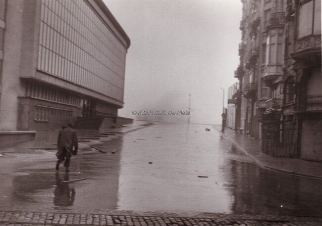 Helling Van Iseghemlaan,van aan de dijk richting kursaal.De schade aan het wegdek door de overstroming 1953.