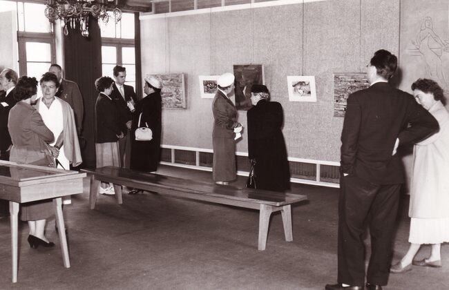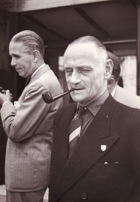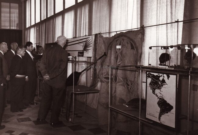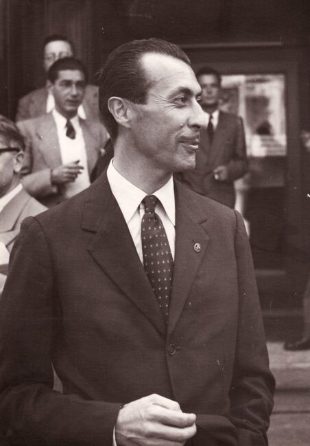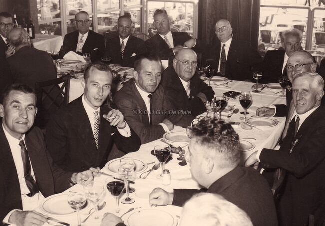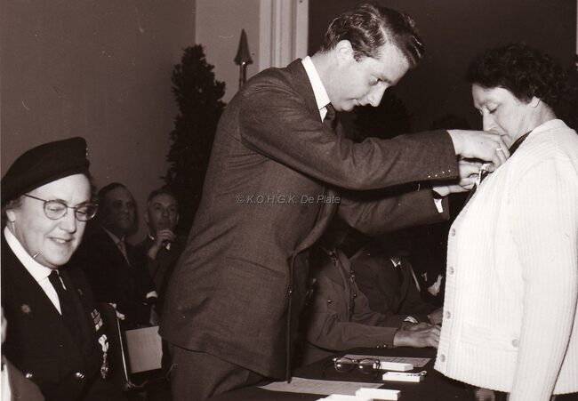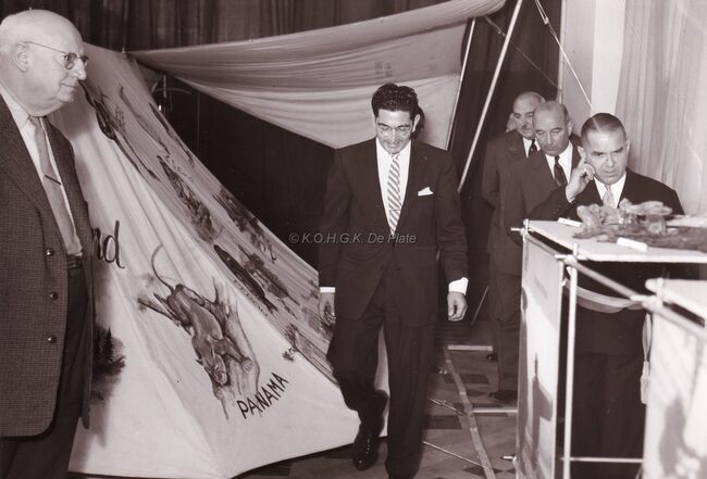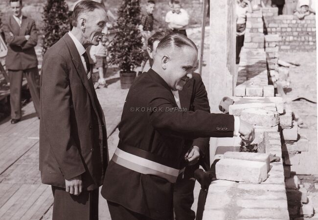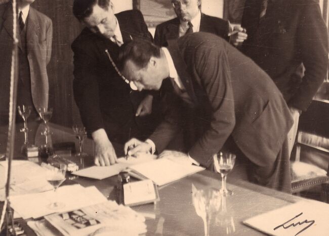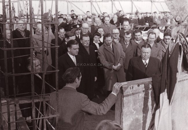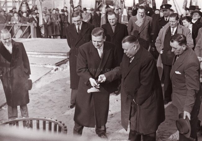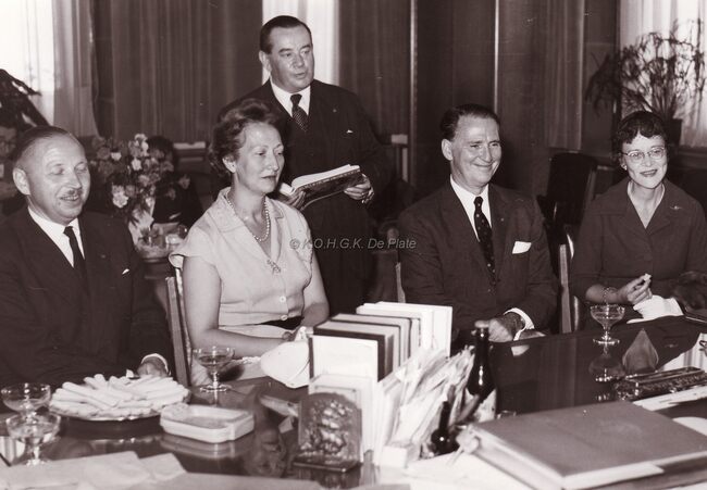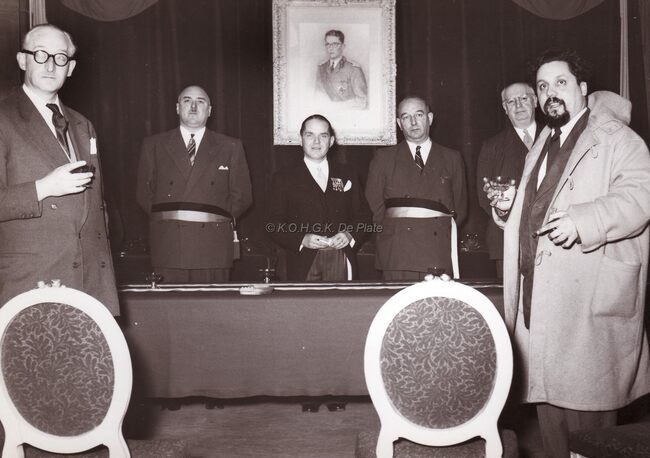 FOTO LUCBLIJDE INTREDESOOSTENDE ; 1959ALBERT II (KONING DER BELGEN)PAOLA (KONINGIN DER BELGEN)PIERS JAN (1920-1998) (BURGEMEESTER)KONINKLIJKE VILLASURMONT MICHEL (1891-1975) (STADSSECRETARIS)VAN CAILLIE FRANCOIS (1909-1971) (NOTARIS POLITICUS)DEHOUCK KAMIEL (1908-1992) (POLITICUS)EDEBAU HENRI (1886-1964) (POLITICUS)