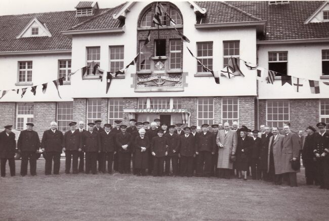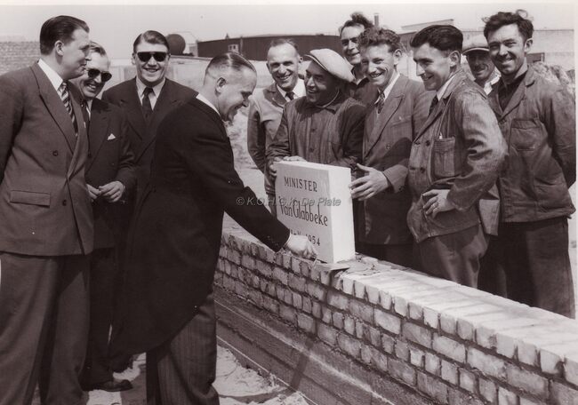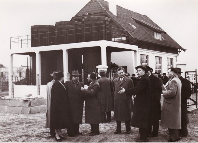 Adolf VAN GLABBEKE, toen minister van Openbare Werken, plaatst de eerste steen van N.V. Morubel visverwerkend bedrijf aan de Fort en Napoleonstraat. Achter hem zien we de zonen VAN COILLIE van de gelijknamige…