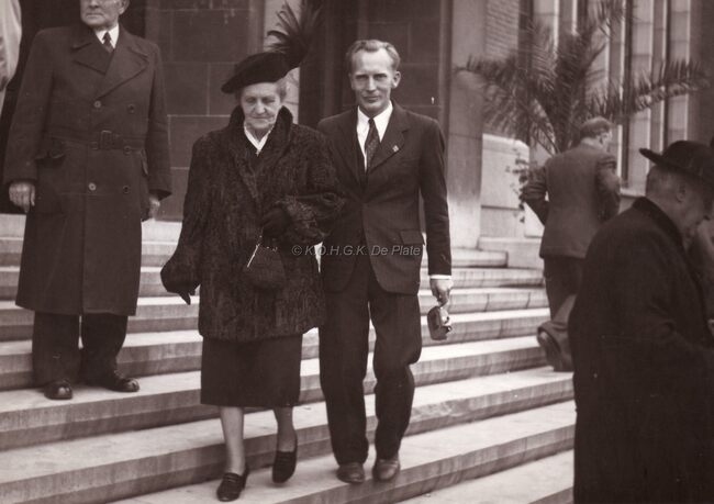 De directrice van het Godtschalck instituut verlaat na een ontvangst het dd. stadhuis (huidig gerechtshof).