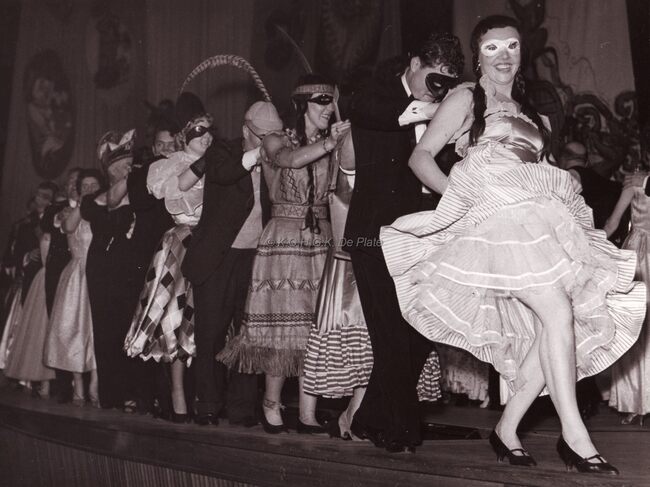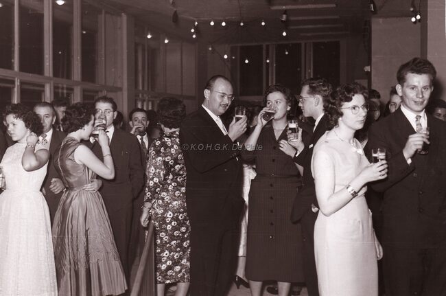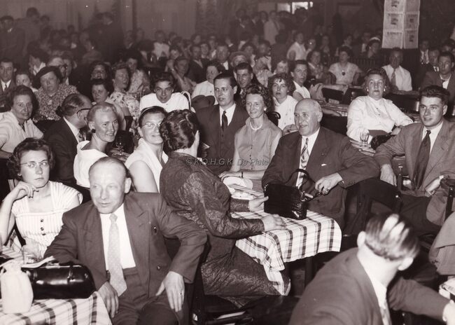 Formaat : 13 x 18 cm. - Personeelsfeest van de firma "Fichefet" in het lokaal "Prins Boudewijn", Sint-Sebastiaanstraat 22. Vereremerkte werknemers en hun familie. Paul Fichefet, links naast mevrouw,…