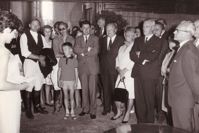 Een dame verwelkomt de genodigden op de renbaan. Centraal Marcel Friederichs,gemeenteraadslid en naast de dame in het wit staat, schepen Louis Vanhoorne