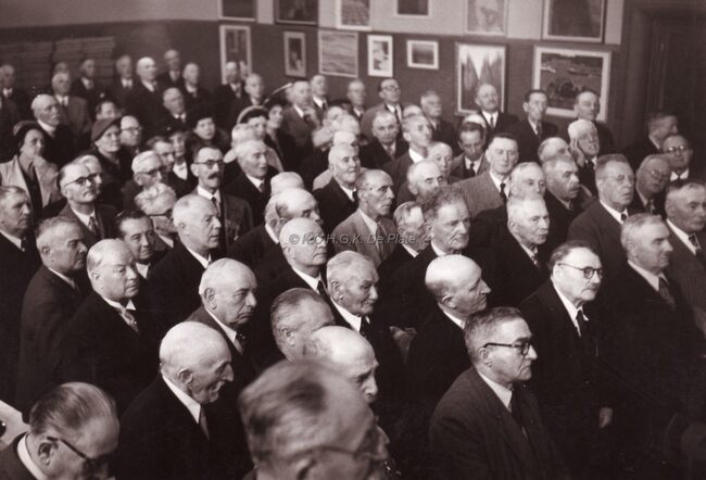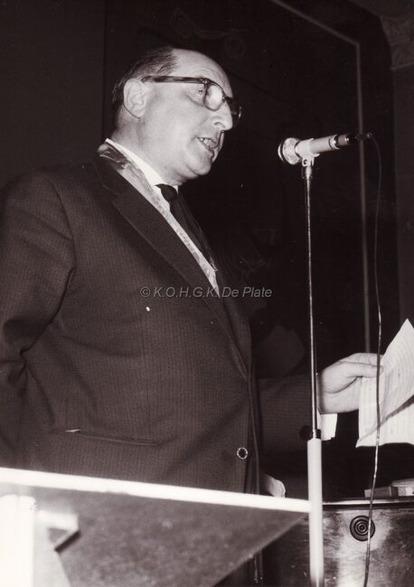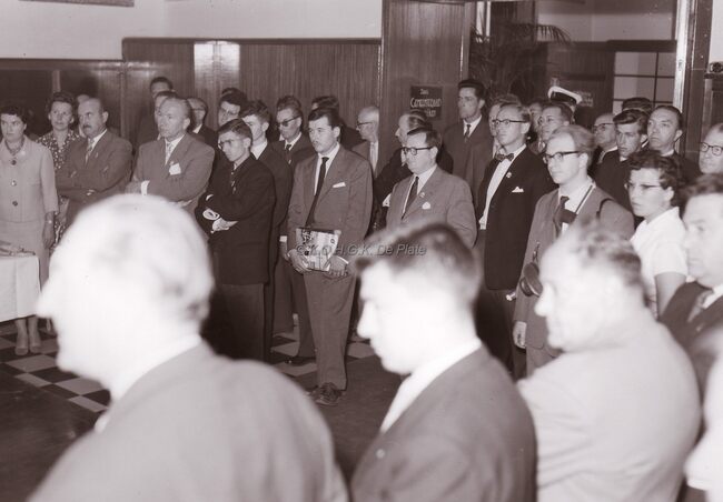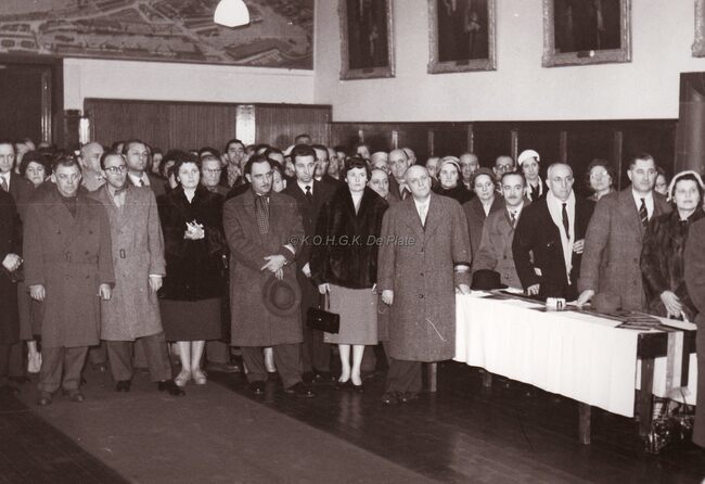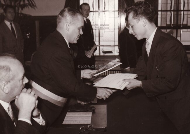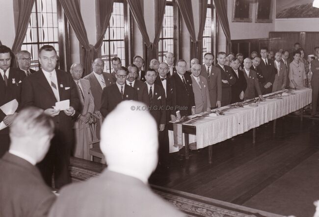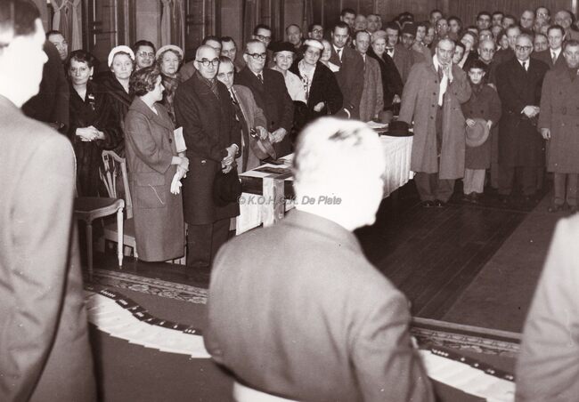 Burgemeester Adolf VAN GLABBEKE bij een prijsuitreiking in het dd.stadhuis (huidig gerechtshof),naast hem zit schepen Kamiel DEHOUCK.