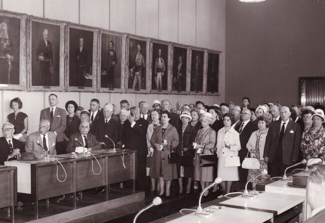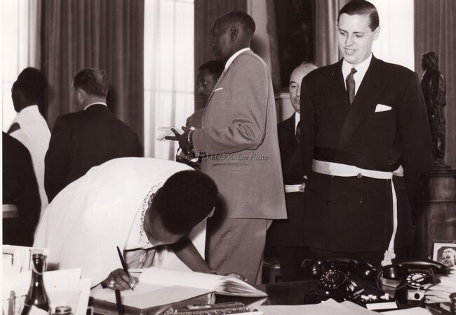 Bezoek van de Mwami van Rwanda. Onder het goedkeurend oog van schepen Jan Piers tekent de echtgenote van de Mwami het gulden boek. Achter schepen Jan Piers, schepen Kamiel Dehouck.