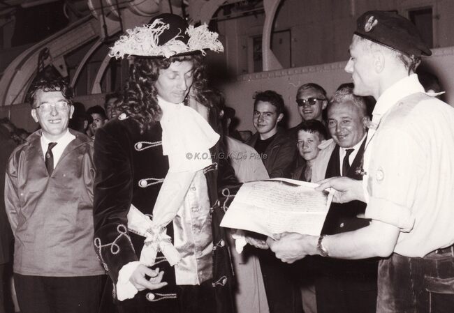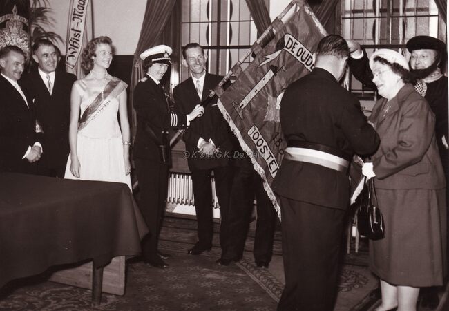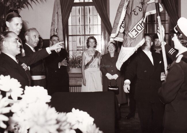 Plechtigheid op het dienstdoend stadhuis (gerechtshof). Burgemeester Adolf Van Glabbeke ontvangt de folkloregroep "De Oude Ijslandvaarders" voor de overhandiging van hun vlag. Ook de schoonheidskonigin 1958,…
