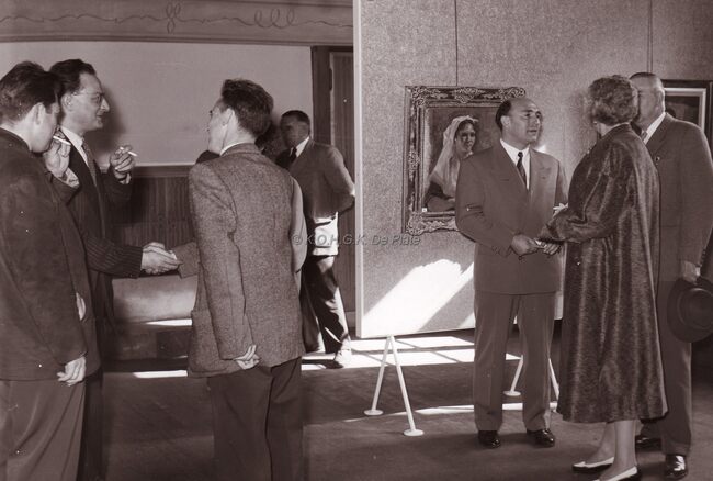 Opening tentoonstelling van "Het Salon van de Oostendse Kunstkring" in de Koninklijke Gaanderijen. Centraal in het wit mevrouw Adolf VAN GLABBEKE (mevrouw MULLIE). Naast haar links, schepen Frans VAN CAILLIE, en…