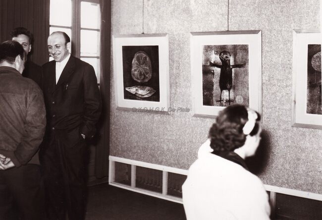 Formaat : 13 x 18 cm. - De kunstenaar in gesprek. Het Museum voor Schone Kunsten, toen gevestigd in de Koninklijke Schouwburg (Van Iseghemlaan). Tentoonstelling ingericht door de kunstkring "Mozaïek"