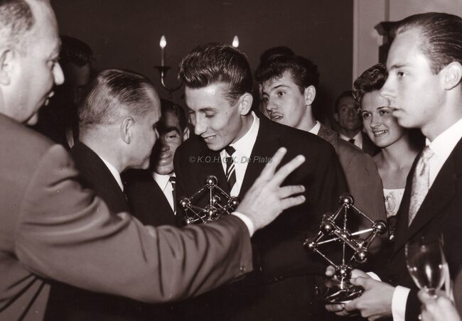 Formaat : 13 x 18 cm. - De zeer gekende Franse wielerkampioen Jacques Anquetil en H. Dehaes(e) (?) worden ontvangen door burgemeester Adolf Van Glabbeke. Zij krijgen een maquette van het Atomium. Op 1 augustus nam…