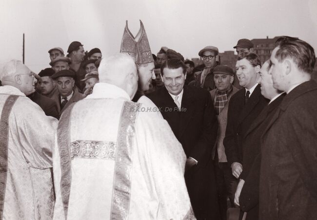 De broers VAN COILLIE van de gelijknamige aannemersfirma verwelkomen Monseigneur De Smet, bisschop van Brugge, op de werf van de nieuwe O.LV. Koninginnekerk van Mariakerke.