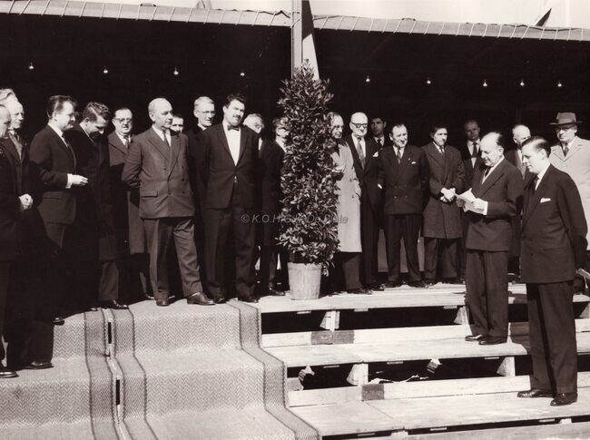 Burgemeester Jan PIERS bij het opstarten van een bouwwerk (?).Vierde,vijfde en zesde van links : schepen John LAUWEREINs, schepen Kamiel DEHOUCK en schepen Roger DEKINDER latere gouverneur van Oost-Vlaanderen.