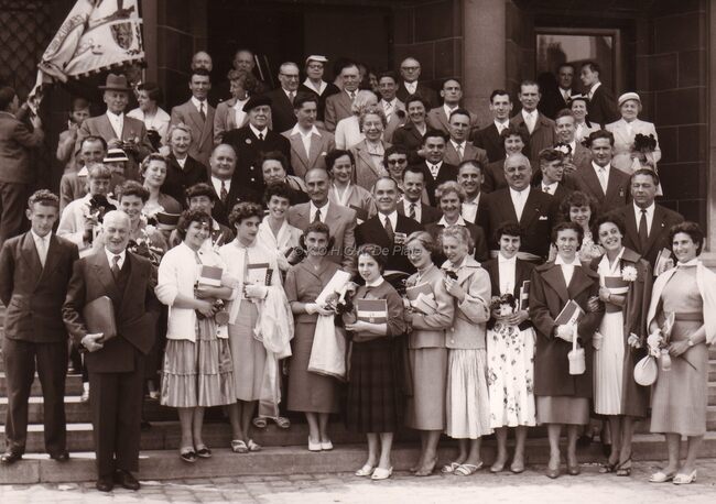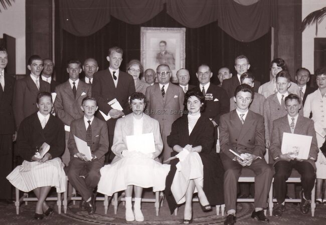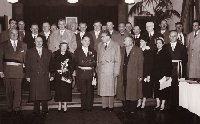 Prijswinnaars bij een ontvangst op het dd. stadhuis (huidig Gerechtshof).Rechtstaand vierde van rechts burgemeester Adolf VAN GLABBEKe,op de achterste rij tweede van links schepen Kamiel DEHOUCK.