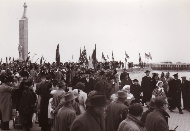 Burgemeester Adolf VAN GLABBEKE en de andre notabelen na afloop van de jaarlijkse huldiging aan het monument op het Zeeheldenplein. Hij is in gesprek met Kamiel DEHOUCK, schepen aan zijn andere zijde John LAUWEREINS,…