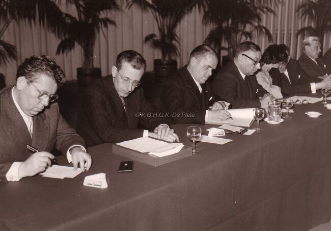 Burgemeester VAN GLABBEKE bij een ontvangst van een groep op het dd. stadhuis (huidig Gerechtshof),links vooraan schepen Maurice QUAGHEBEUR,rechts schepen Kamiel DEHOUCK,4e van rechts op de tweede rij Michel SURMONT…