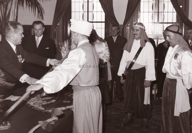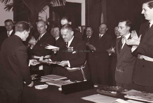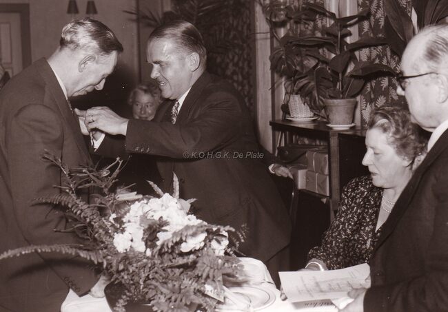 Burgemeester Adolf VAN GLABBEKE vereremerkt een lid van het E.D.B. (?) in het dd.stadhuis (huidig Gerechtshof).