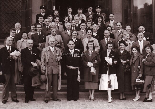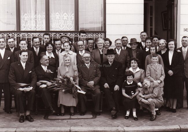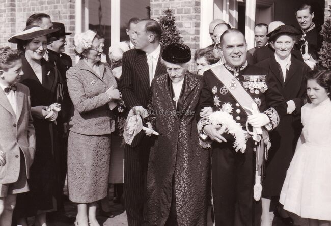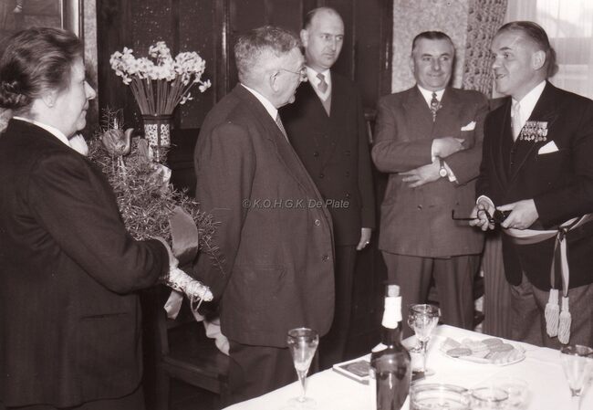 Burgemeester Adolf VAN GLABBEKE op een gouden(of diamanten) bruiloft,achter de burgemeester staan de heer en mevrouw WALLYN met hun zoons John en Marc (achteraan).Mogelijk zijn de jubilarissen de ouders van mevrouw WALLYN…