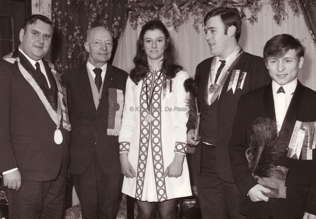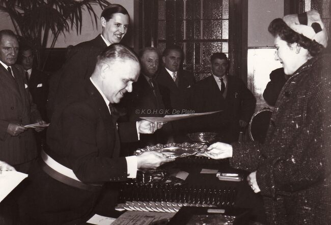 Burgemeester bij een prijsuitreiking in het dd. stadhuis (huidig Gerechtshof).Uiterst links Kamiel DEHOUCK,schepen (in profiel),achter de burgemeester Jan PIERS de latere burgemeester.