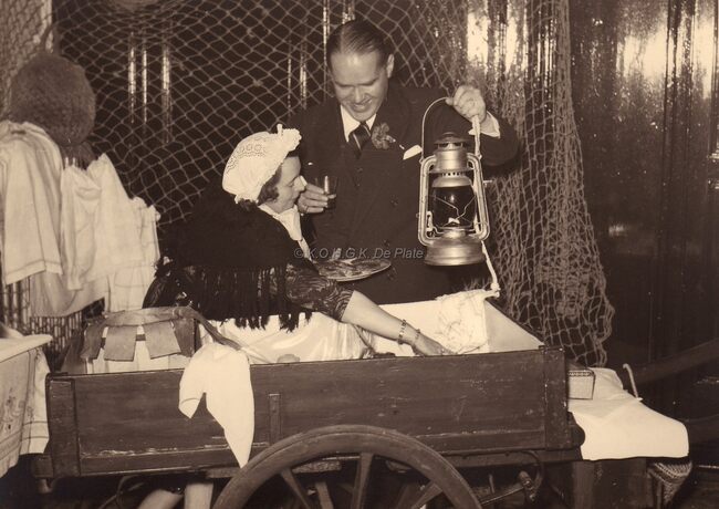 Burgemeester Adolf VAN GLABBEKE en een visvrouwtje bij een kar zoals toen in gebruik door de visverkoopsters die er mee langs de Oostendse straten trokken.Hij heeft de lantaarn vast (zie ook foto 2012/0321).