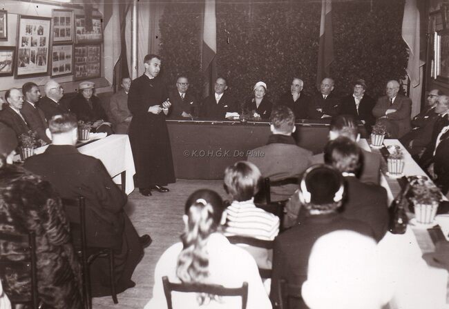 De proost van Licht en Liefde BRONDERS houdt een toespraak op een vergadering. Centraal achter de tafel burgemeester Adolf VAN GLABBEKE en zijn echtgenote, naast haar deken BUTAYE en KamieL DEHOUCK, schepen. Rechts ook…