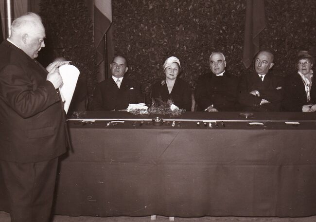 Toespraak door een onbekende heer,achter de tafel luisterEn toe van links naar rechts,burgemeester Adolf VAN GLABBEKE,zijn echtgenote,deken BUTAYE,schepen Kamiel DEHOUCK en een onbekende dame.