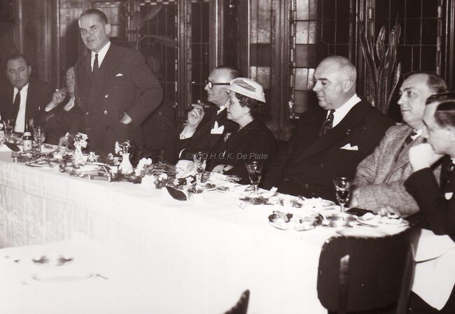 Burgemeester Adolf VAN GLABBEKE en zijn echtgenote (3e en 5e van links) op een banket,tussen hen zit Richard PANESI,scheepsbouwer.