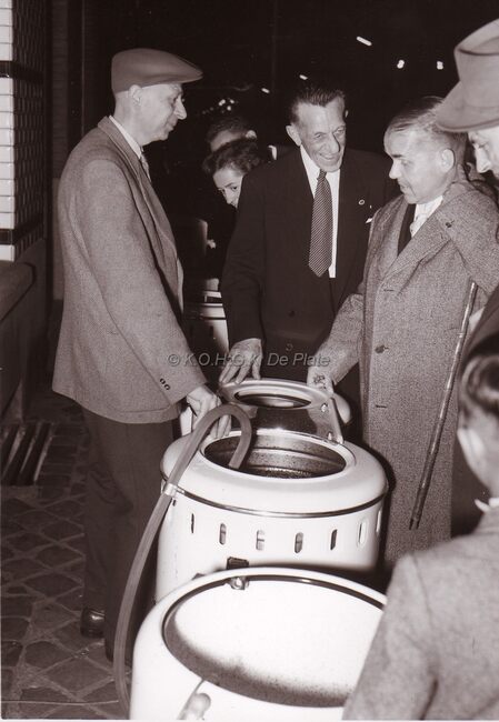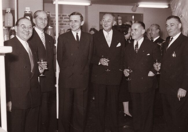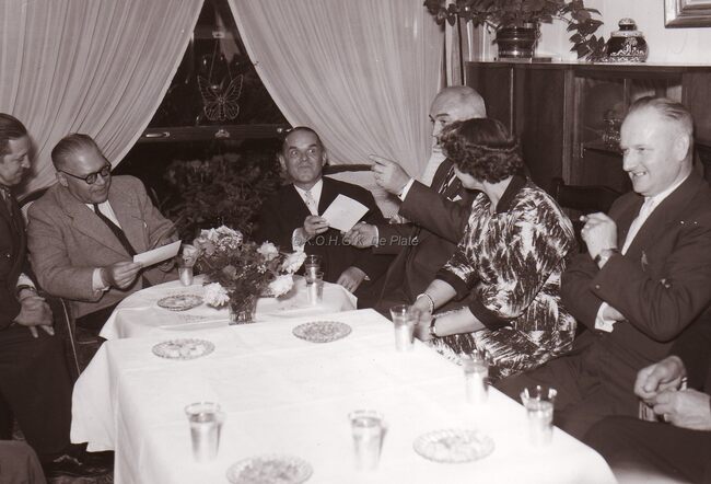 Burgemeester Adolf VAN GLABBEKE (tweede van rechts) en provinciegouverneur Pierre VAN OUTRYVE D' YDEWALLE (derde van links) op een receptie (opening van een handelszaak ?).