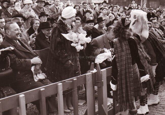 Burgemeester Adolf Van Glabbeke met zijn echtgenote wordt begroet door drie leden van de Oostendia Schotten tijdens de 1e Rattestoet op het Wapenplein