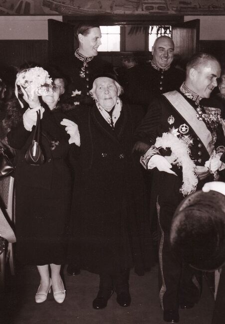 Burgemeester Adolf VAN GLABBEKE met de 100 jarige Sylvie STALMANS-FOCKEDEY aan de arm tijdens haar ontvangst op het stadhuis. Links achter schepen Jan PIERS, uiterst rechts, deurwachter Henri LANOYE. Wwe STALMANS-FOCKEDEY…