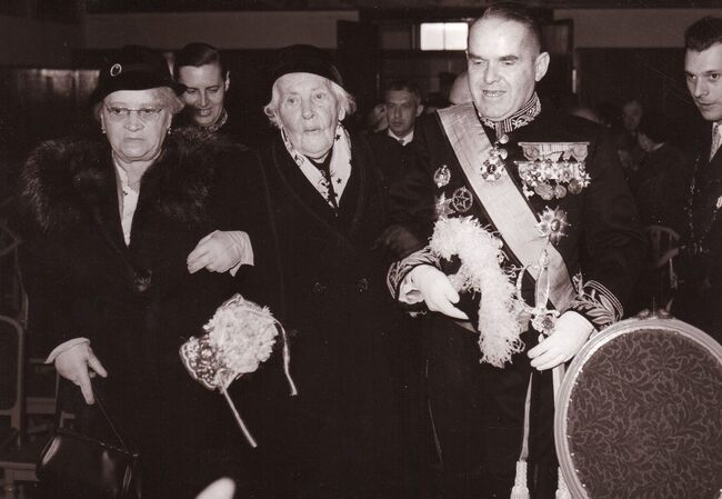 Burgemeester Adolf VAN GLABBEKE klinkt met de 100 jarige Sylvie FOCKEDEY ter gelegenheid van haar ontvangst op het dd. stadhuis (huidig Gerechtshof).