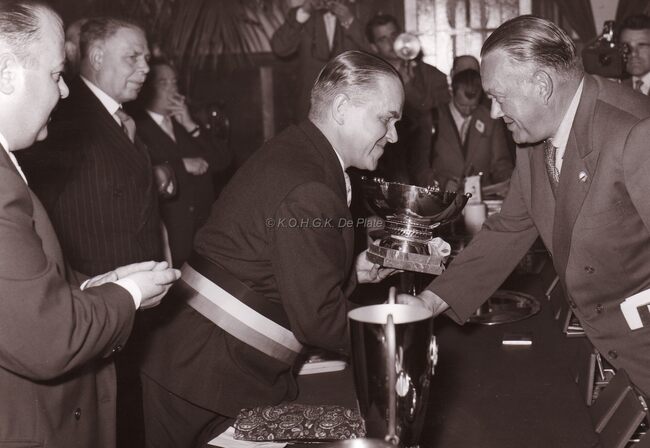 Burgemeester Adolf VAN GLABBEKE overhandigt een beker in het dd. stadhuis (huidig Gerechtshof) aan een onbekende heer.