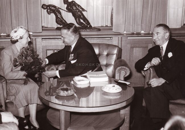 Burgemeester Adolf VAN GLABBEKE zet een onbekende dame in de bloemetjes, haar echtgenoot (?) zit er glunderend bij. Ontvangst op het kabinet van de burgemeester in het Gerechtshof (toen dienstdoend stadhuis)