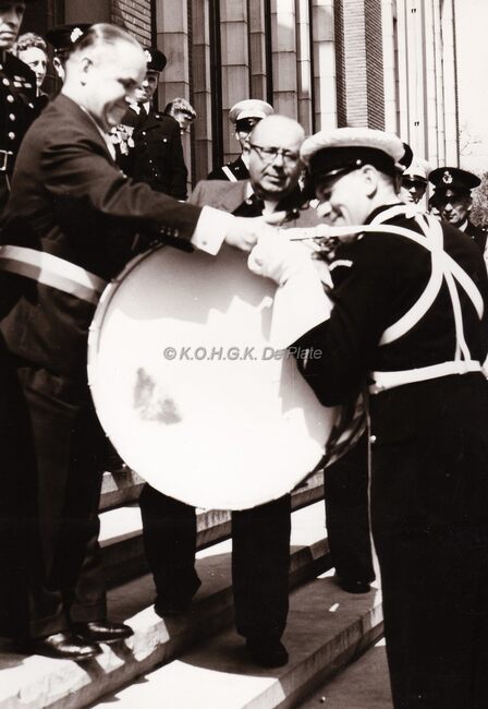 Burgemeester Adolf VAN GLABBEKE overhandigt op de trappen van het dd. stadhuis (huidig Gerechtshof) een grote trom aan de kliek van de stedelijke politie.